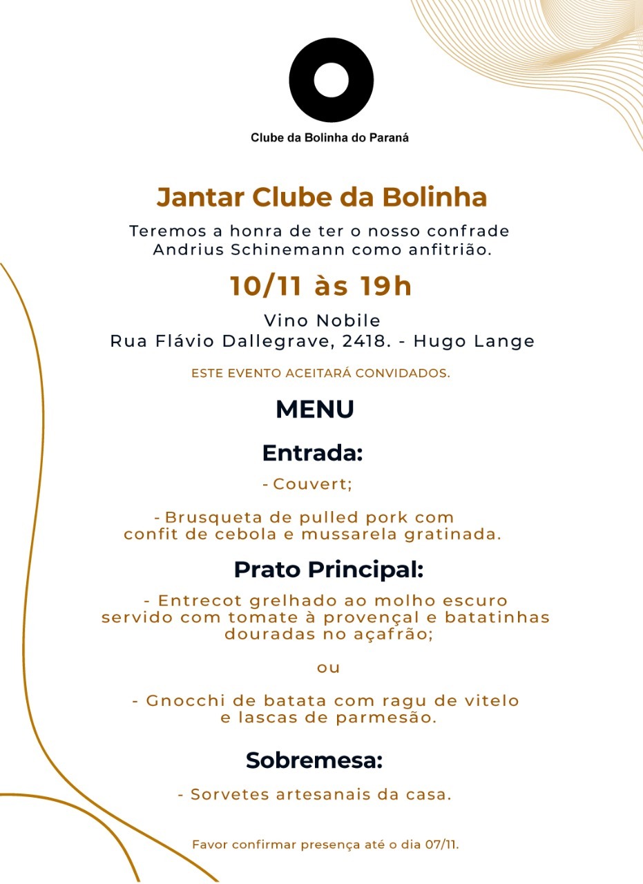 A reunião de Novembro/2025 do Clube da Bolinha do Paraná acontecerá no próximo dia 10/11, no Vino Nobile Gastronomia (R. Flávio Dallegrave, 2418 – Hugo Lange, Curitiba/PR – veja no mapa) e terá o Bolinha Andrius Rogério Schinemann como anfitrião.