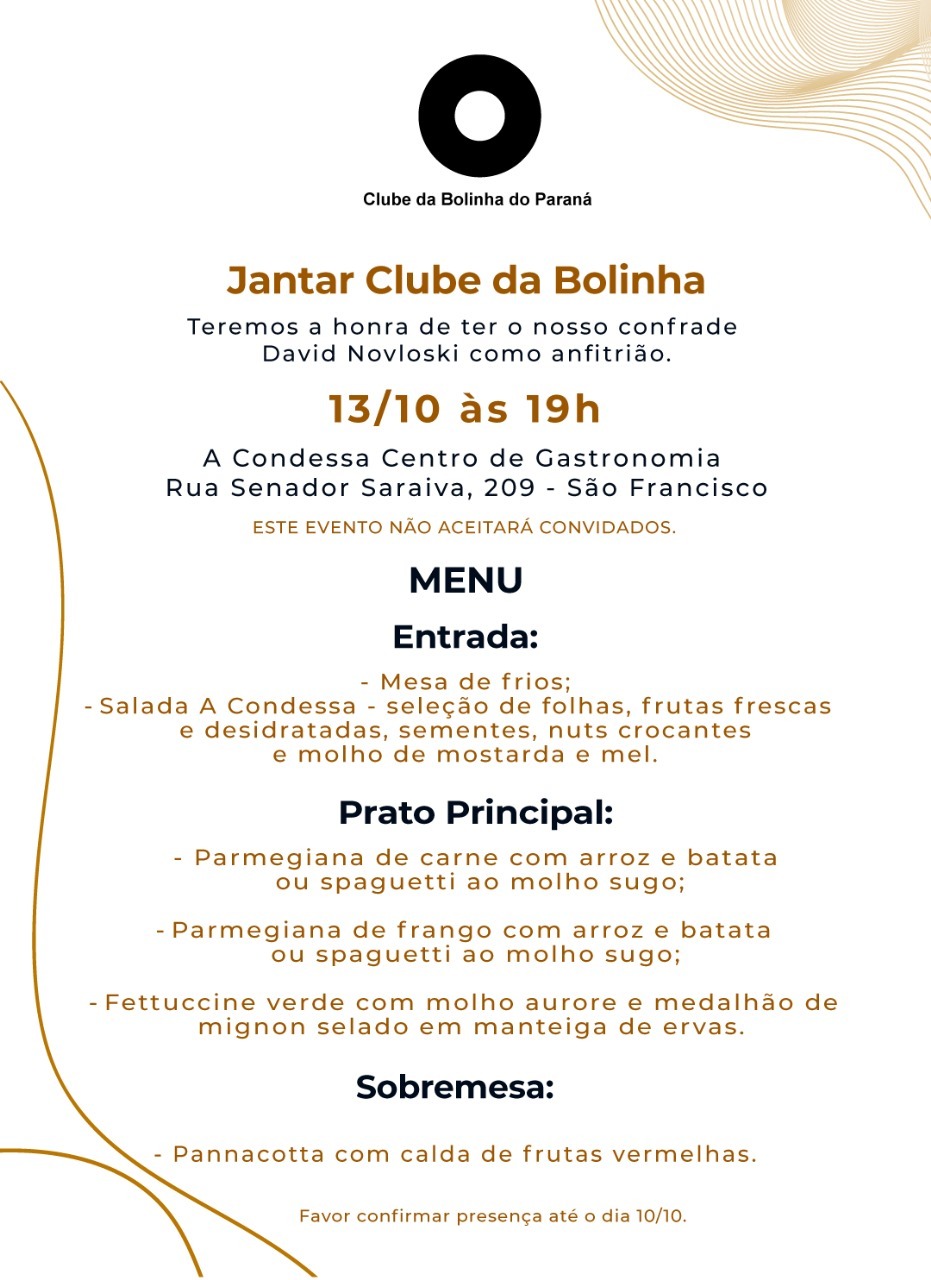 No próximo dia 13/10, no A Condessa – Centro de Gastronomia (R. Sen. Saraíva, 209 – São Francisco, Curitiba/PR – veja no mapa), o Clube da Bolinha do Paraná realizará sua reunião/jantar do mês de Outubro/2025, que terá como Anfitrião o Bolinha David Novloski.
